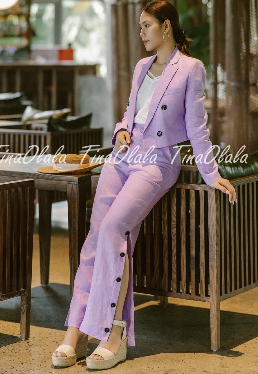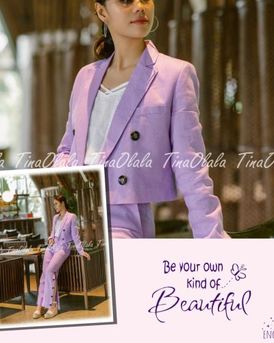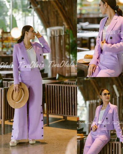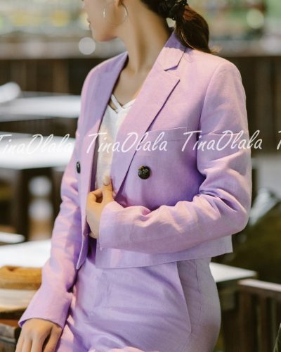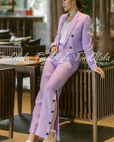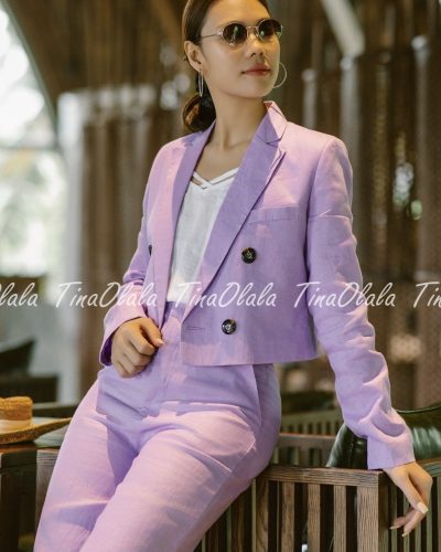 Step into timeless sophistication with our Lavender Linen Blazer Set for Women — a modern essential crafted from 100% breathable linen. This two-piece ensemble features a cropped, double-breasted blazer and tailored high-waist trousers, designed to flatter your silhouette while keeping you effortlessly cool.