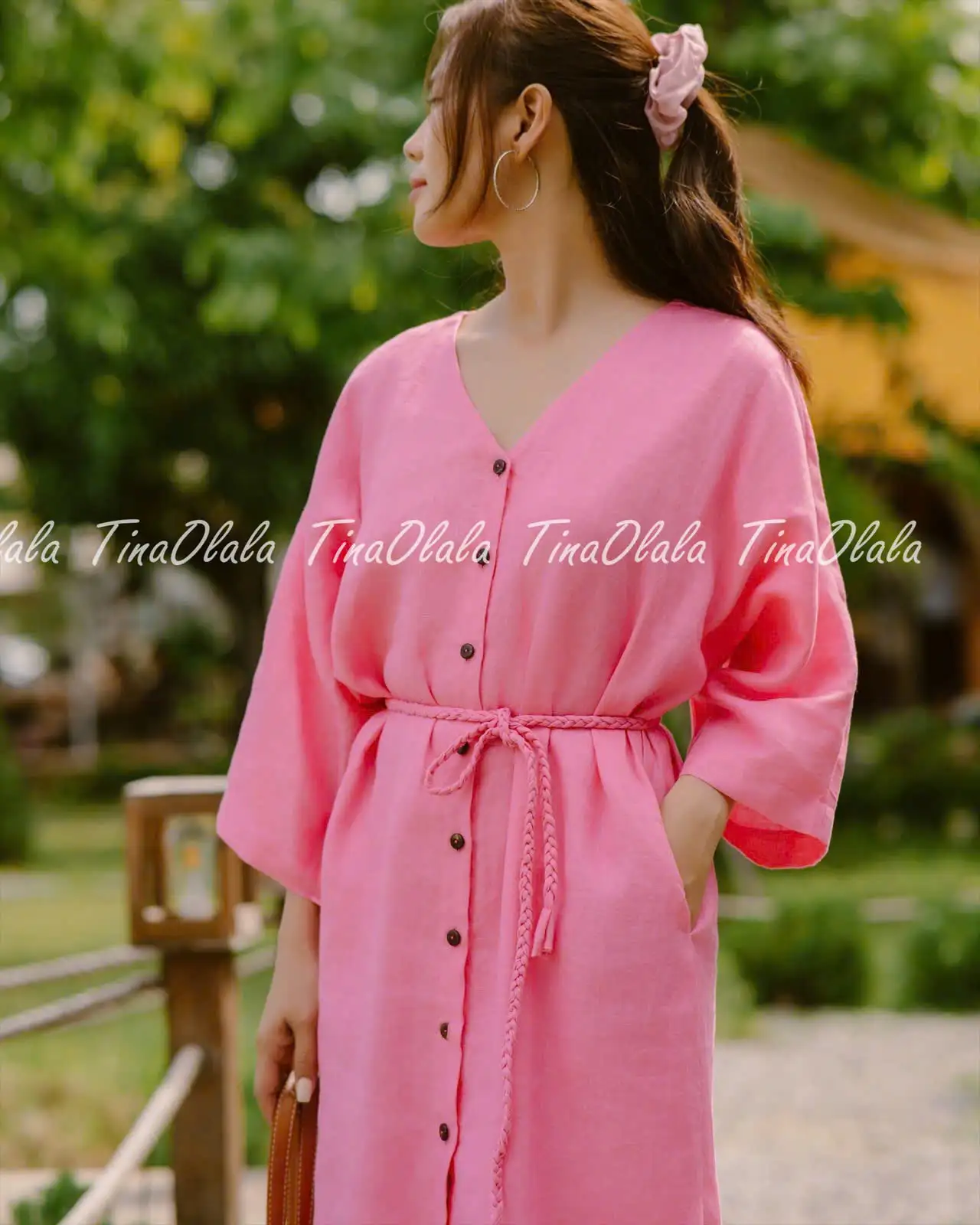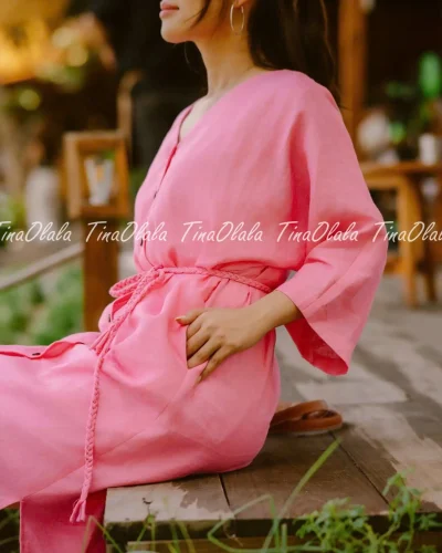 Linen Pinky Casual Dress – A beautifully crafted Linen Women Clothing piece made from 100% natural linen, known for its breathability, softness, and eco-friendly qualities. This Linen Casual Dress in a radiant pink shade is designed with a relaxed yet flattering silhouette, featuring a feminine Linen V neck dress cut, a row of delicate buttons down the front, and a waist tie that allows you to adjust the fit to your liking. The three-quarter sleeves provide just the right amount of coverage while maintaining a light, airy feel, making it