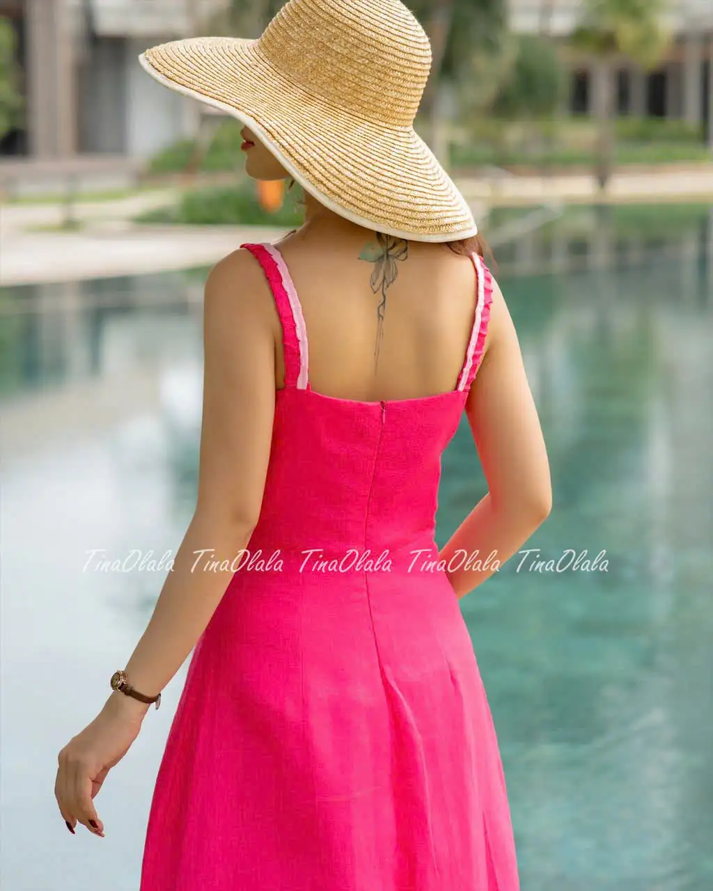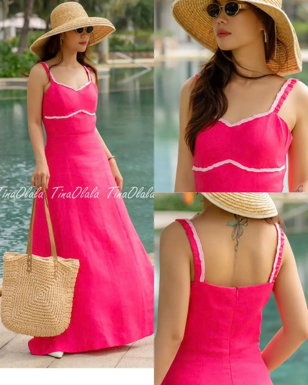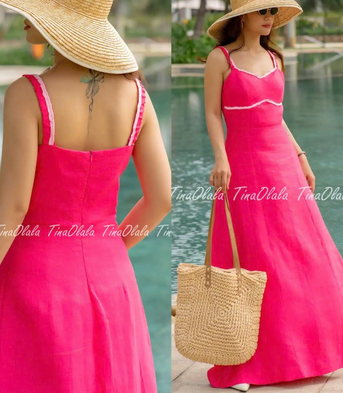 From the back, a clean invisible zipper closure ensures a flattering, snug fit around the bodice, while the full-length A-line skirt drapes beautifully for graceful movement. Perfect for sunny adventures, from poolside escapes to tropical holidays.