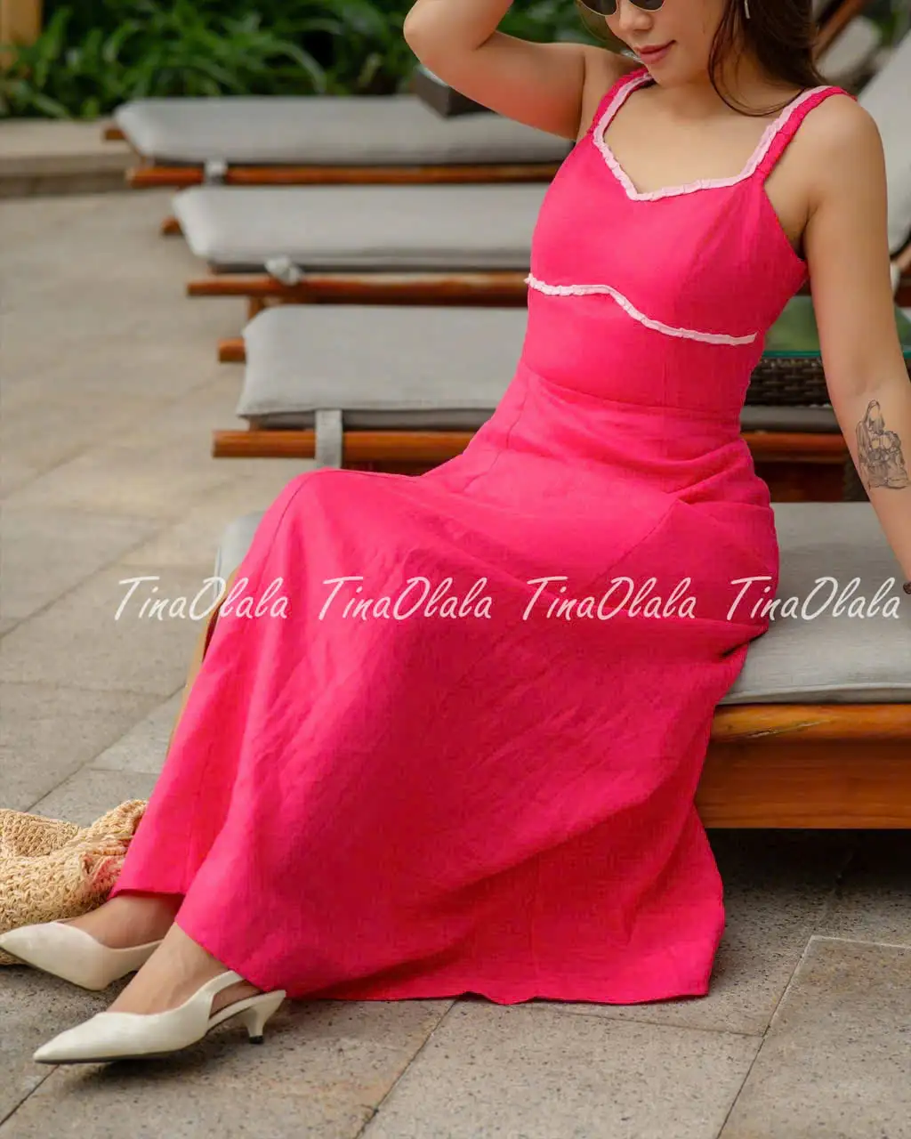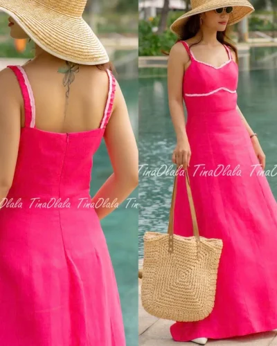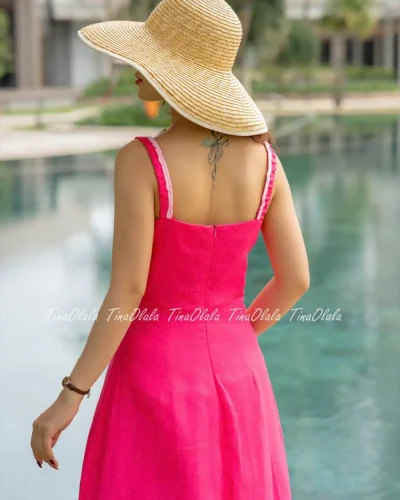 Make a confident and colorful statement in this gorgeous Linen Summer Dress, crafted from 100% breathable linen in a vibrant fuchsia hue. Featuring a curved neckline, contrast white piping, and adjustable straps, this dress combines playful charm with timeless elegance.