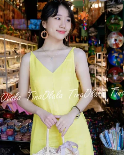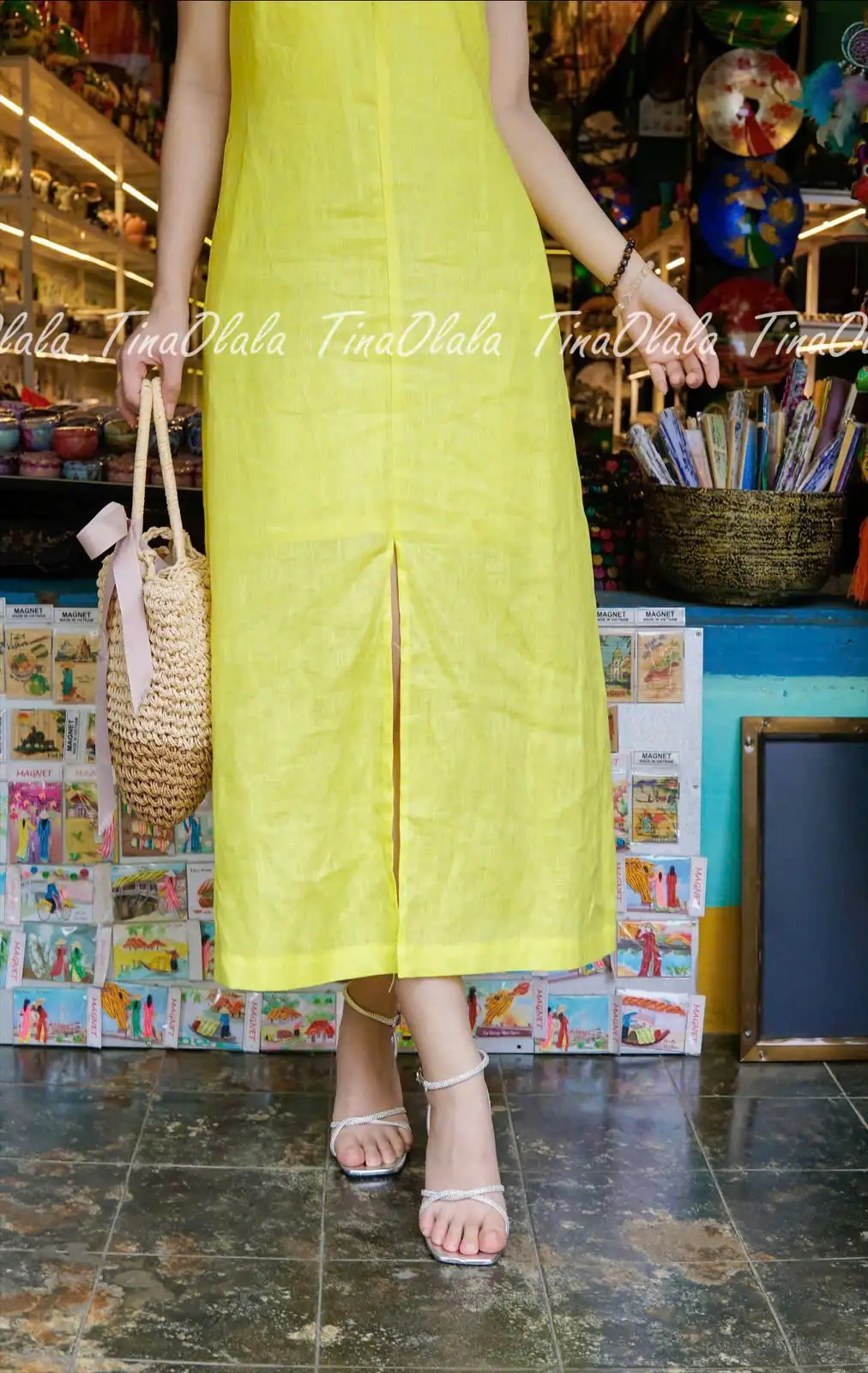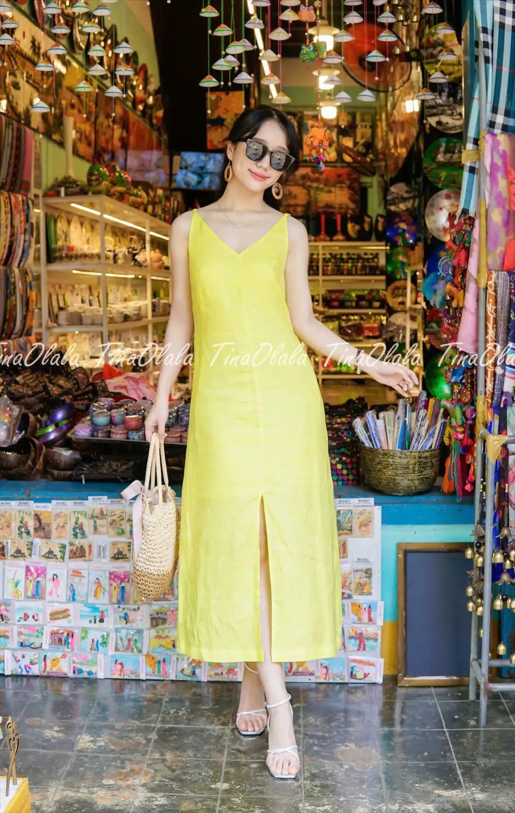 A front center slit not only enhances mobility but also gives the silhouette a modern, airy feel – perfect for both casual strolls and dressed-up summer evenings. The vibrant sunflower yellow instantly brightens your look and mood, making it an irresistible choice for vacations, brunch dates, and warm-weather celebrations.