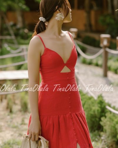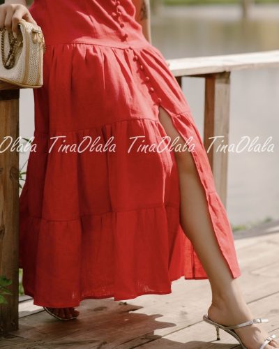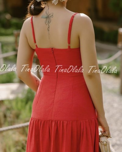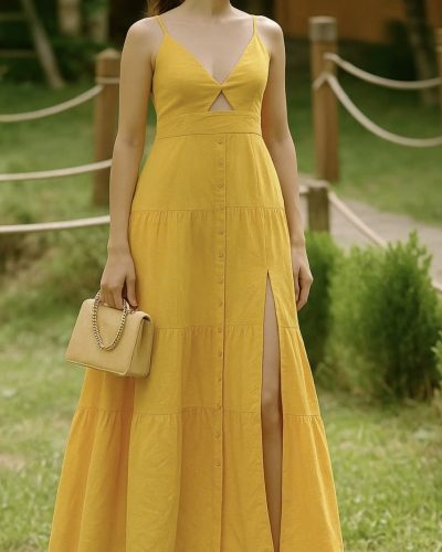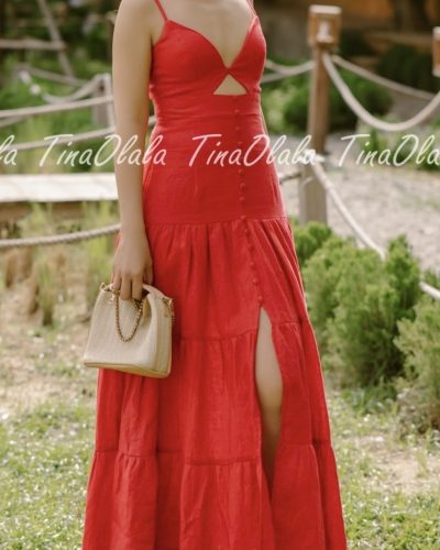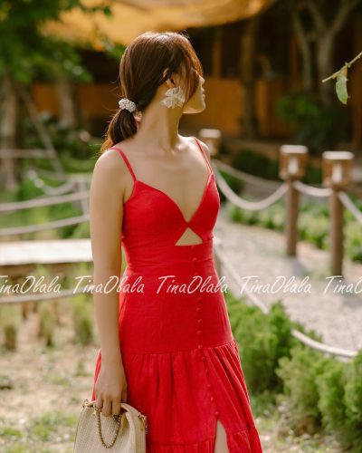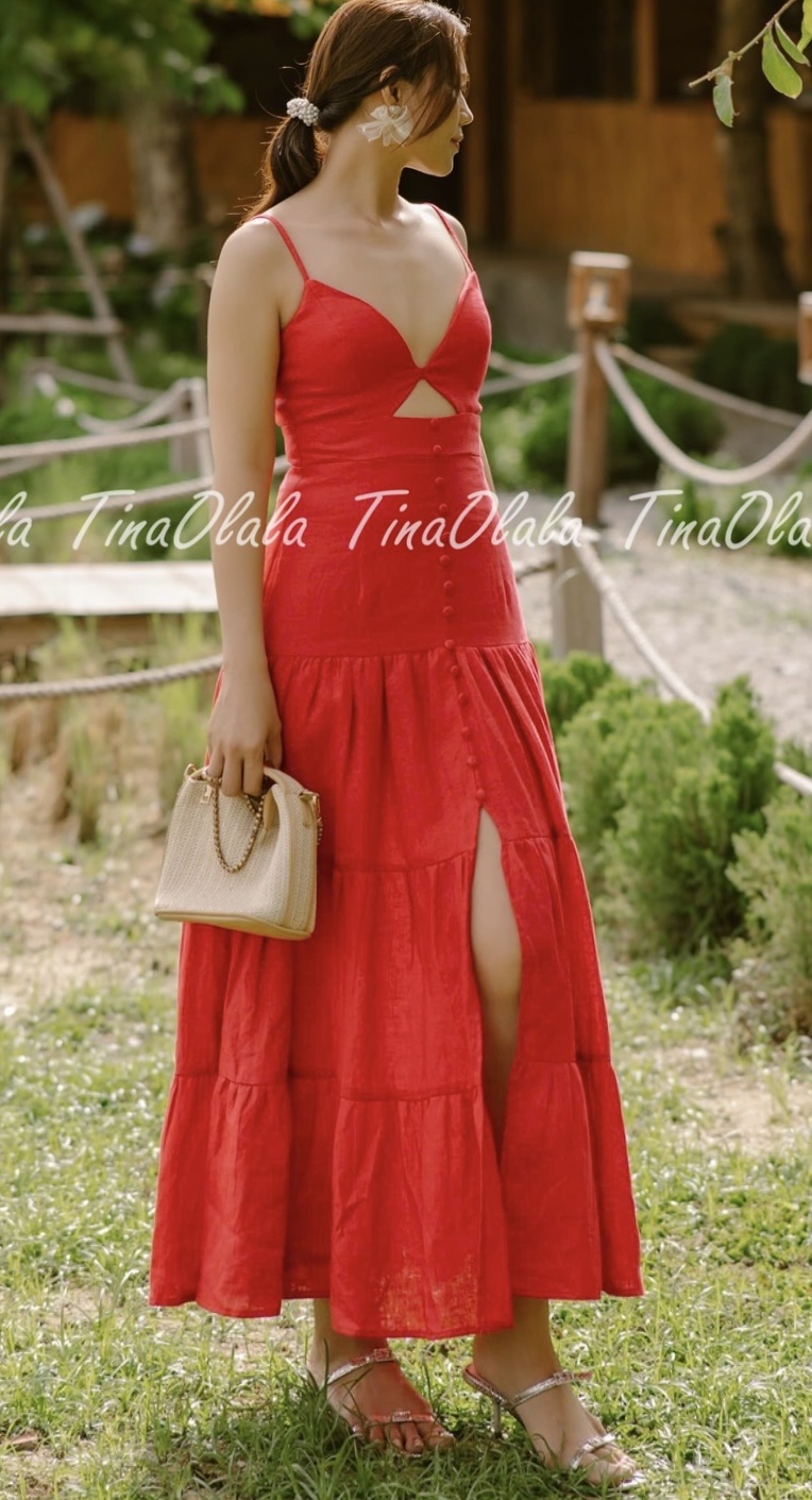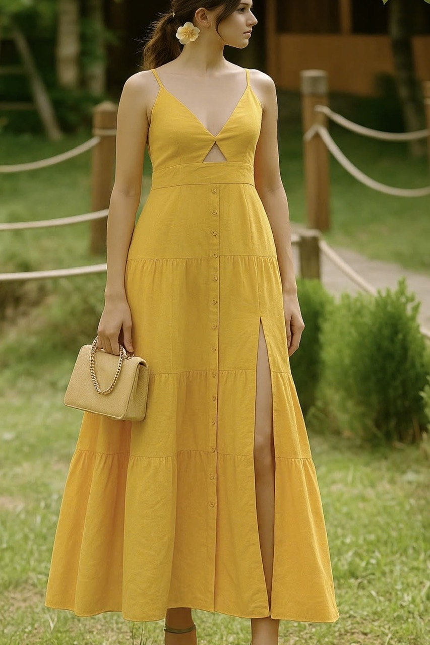 Featuring a flattering V-neckline with a subtle front cut-out and delicate spaghetti straps, this dress hugs your figure in all the right places. The tiered skirt and front slit add volume, movement, and just the right touch of drama. Whether you’re dancing at a garden party or walking barefoot on the beach, this Linen Dress for Women offers both freedom and flair.