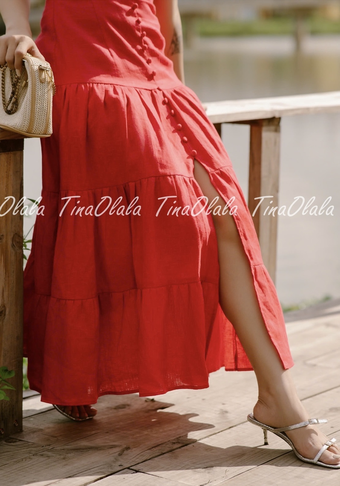 - Tiered A-line silhouette with a front slit for breezy movement