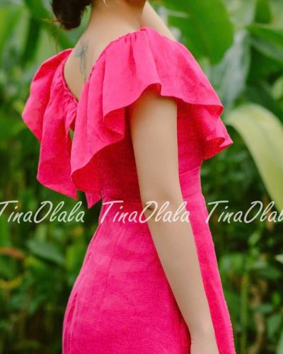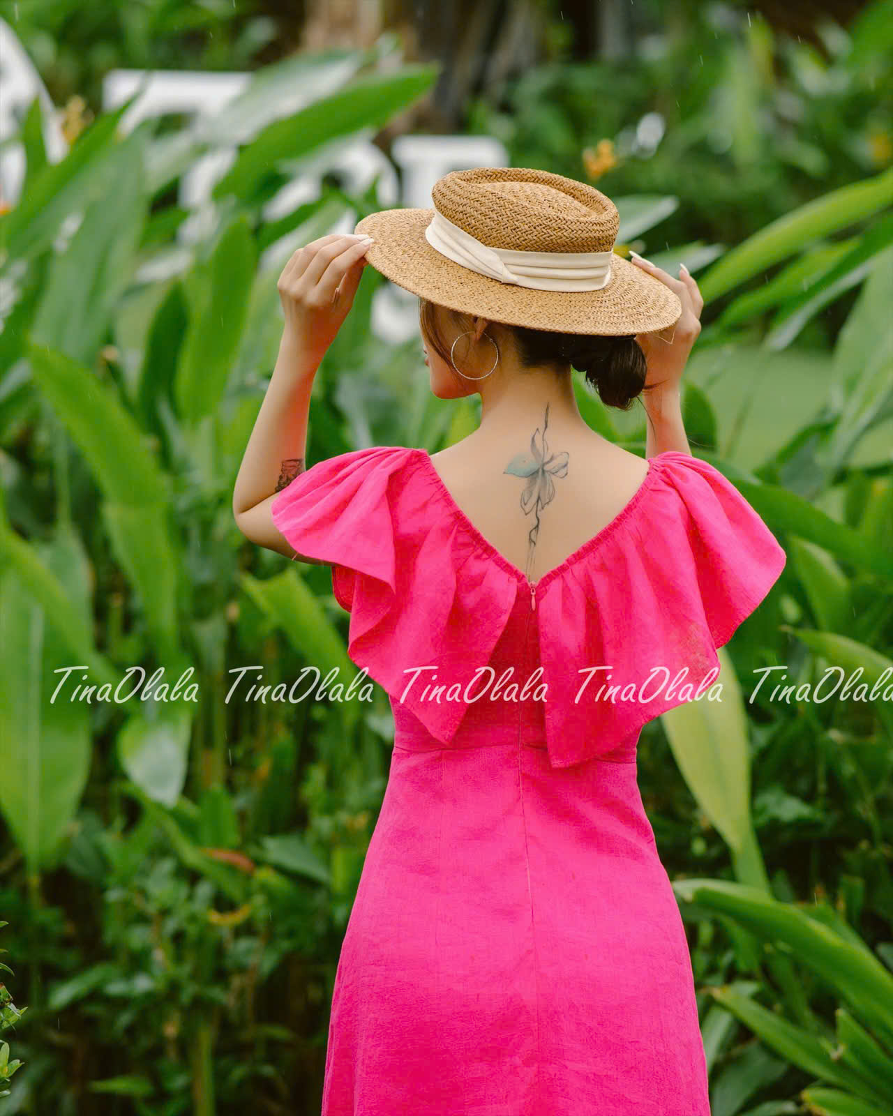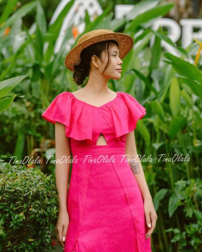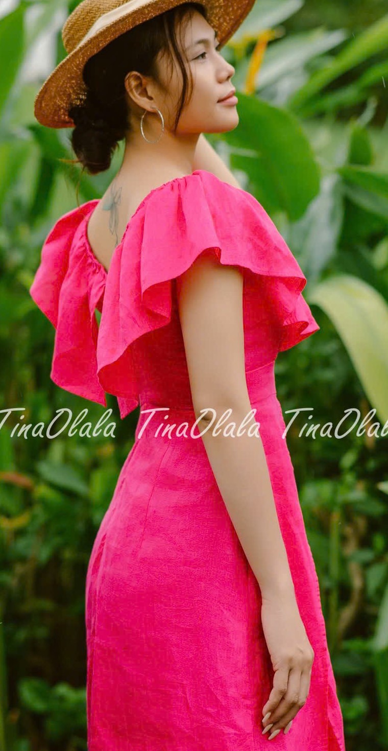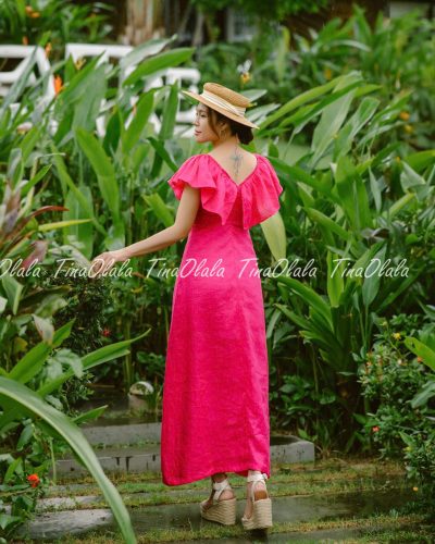 Fierce, feminine, and designed to turn heads — the Tropical Flame Linen Dress brings a bold twist to summer style. Crafted from 100% breathable linen in a striking fuchsia hue, this Linen Summer Dress features dramatic ruffled sleeves, a tasteful front cut-out, and a thigh-high slit for maximum impact and comfort.